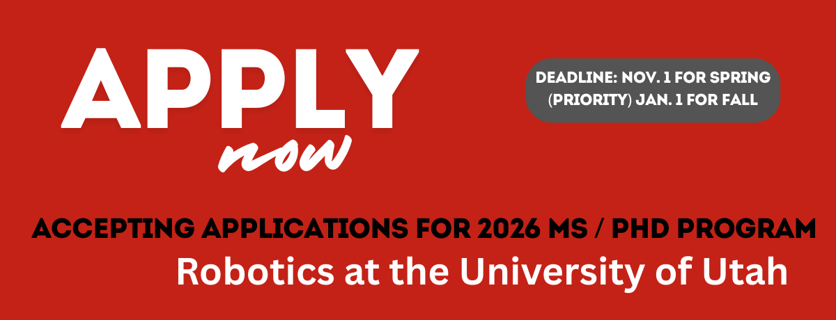 We are excited to announce that the University of Utah now offers degrees and certificates in Robotics! The Robotics Center supports and assists the University of Utah in the development and offering of curriculum for a variety of academic programs in Robotics, including the MS and PhD degrees in Robotics, undergraduate and graduate certificates in Robotics, and an undergraduate minor in Robotics. The Robotics Center retains primary responsibility for the curriculum, in cooperation with the Department of Mechanical Engineering, the Department of Electrical and Computer Engineering, and the Kahlert School of Computing.